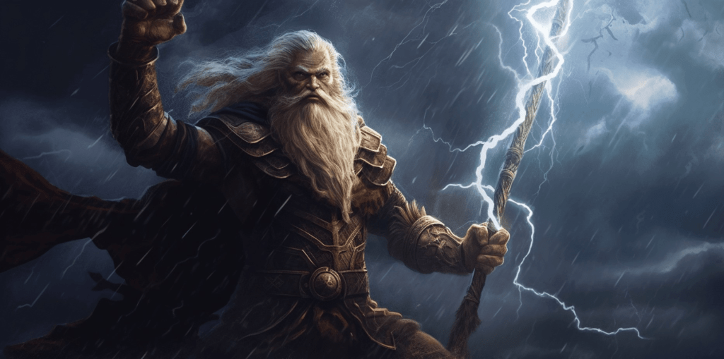 Odin mounted his chariot and withdrew a thunderbolt from his satchel. Looking to the sky, he threw it with his might and pierced the heavens opening the gate between Asgard and Midgard. The gods ascended once more and through the portal disappeared.